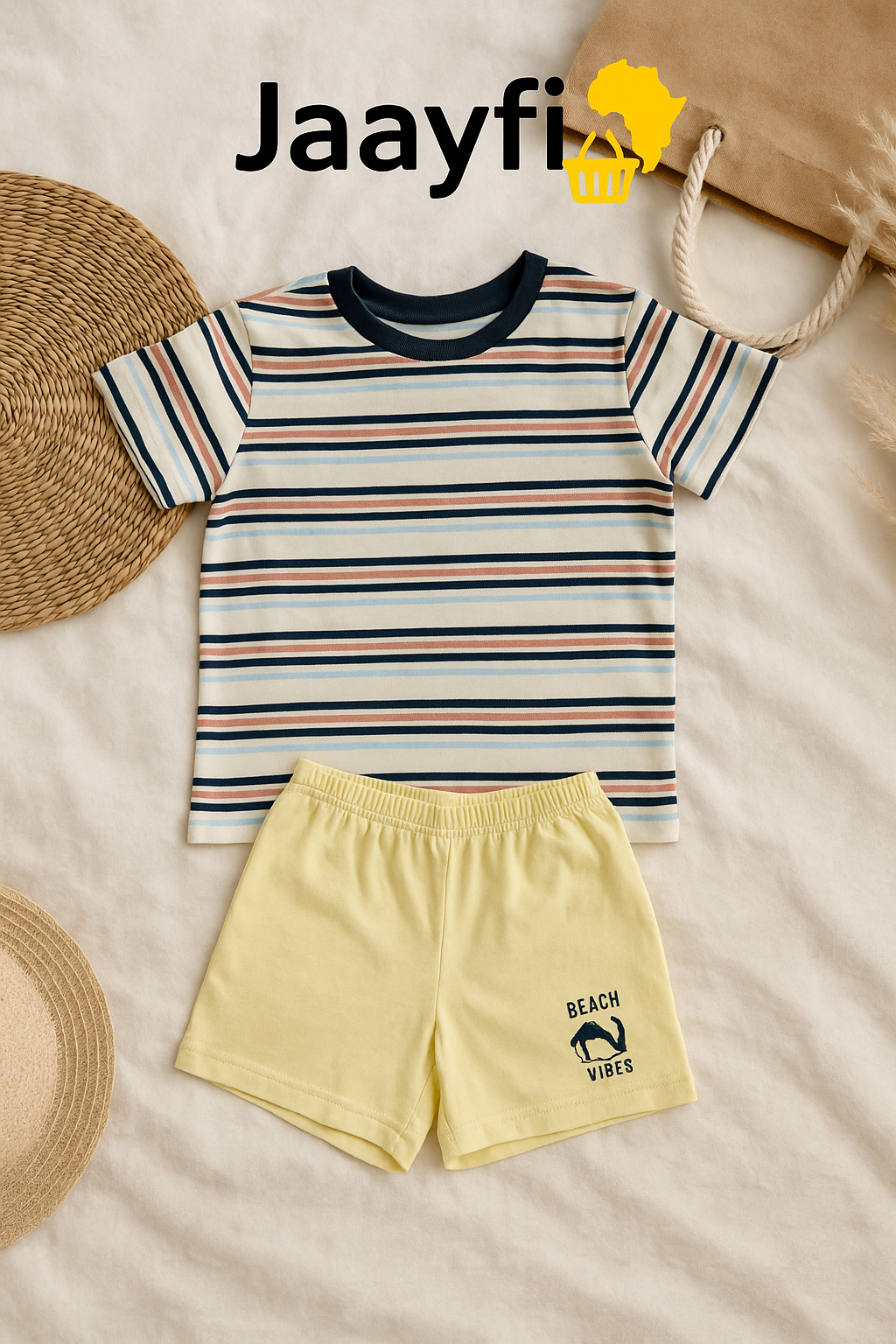 Un joli ensemble pour garçon, composé d’un t-shirt rayé et d’un short jaune imprimé Beach Vibes.